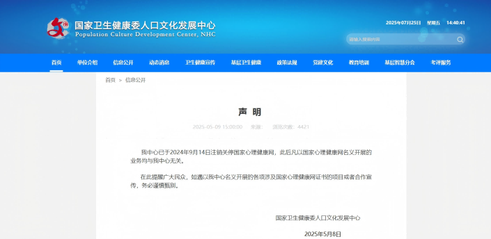 近日,国家卫生健康委人口文化发展中心发布声明,声明内容为:“我中心已于2024年9月14日注销关停国家心理健康网,此后凡以国家心理健康网名义开展的业务均与我中心无关。在此提醒广大民众,如遇以我中心名义开展的各项涉及国家心理健康网证书的项目或者合作宣传,务必谨慎甄别。”