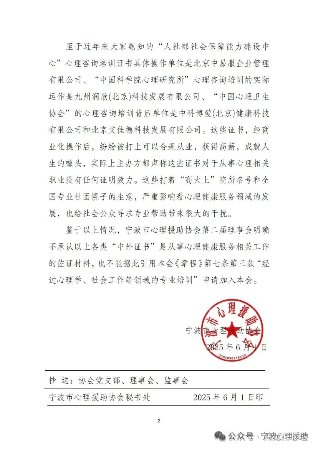 宁波市心理援助协会强调不承认以上任何“所谓的心理咨询师证书”作为心理健康服务从业资质或入会依据。宁波市心理援助协会此次颁发文件不仅是对“山寨心理咨询师证书”进行严厉的打击,更是加强行业管理和行业自律的具体体现。