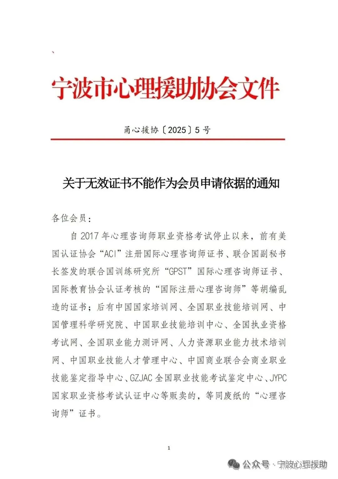 近日, 5A级社团宁波市心理援助协会发布《关于无效证书不能作为会员申请依据的通知》,这是全国首个社团组织以文件形式向“山寨心理咨询师证书”亮剑。